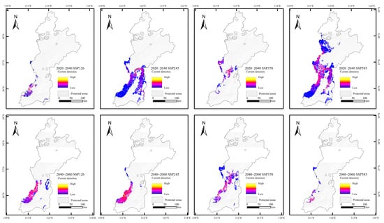 Currently, the areas with a high current density are mainly distributed along the Lüliang Mountain Range, and we discovered a total of 20 pinch points, as shown in Figure 3c. The current densities varied significantly between the climate scenarios, as shown in Figure 9. An area of high current density was distributed in the southwest of the basin in 2030s SSP126 and 2050s SSP126, SSP245, and SSP585. A moderate current density was spread in the middle of the basin in 2030s SSP245, SSP370, and SSP585 and 2050s SSP370. As a necessary route for BEP dispersal, the pinch point areas with high current density were crucial areas that need to be protected to enhance the habitat connectivity.