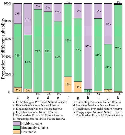 Within the region studied, there were 11 nature reserves with a total area of 1496.98 km2 that serve to preserve the BEP. Patches of BEP habitat were found in all the nature reserves, as seen in Figure 3b. Within the Fen River Basin, the extent of the protected areas is much smaller than the extent of suitable habitats. Currently, 90.84% of the BEP habitat patches remain unprotected in the study area. Figure 3c shows that the Luyashan National Nature Reserve and three provincial nature reserves (Fenheshangyou Nature Reserve, Yundingshan Nature Reserve, and Hanxinling Nature Reserve) had relatively high current densities. The only one with a high current density in the 2030s and 2050s was Hanxinling Provincial Nature Reserve. In Figure 10, suitable habitats in the central part of the watershed are covered by protected areas only under the 2030SSP245, 2030SSP370, 2030SSP585, and 2050SSP370 scenarios. Suitable habitats in other areas are not covered by protected areas. Figure 11 shows the different suitabilities of the nature reserves at the present time. Under the climate scenarios, Hanxinling Provincial Nature Reserve and Huoshan Provincial Nature Reserve both had locations with a reasonably high current density (Figure 9) for both 2030s SSP245 and 2030s SSP585.