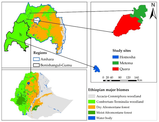 The study was carried out in Metema and Quara districts located in the Amhara National Regional State and in the Homosha district located in the Benishangul Gumuz National Regional State (BNRS), Northwest lowlands of Ethiopia. These districts were selected because they reflect the high dominance of the Combretum-Terminalia woodland and wooded grasslands (Figure 1), which occur in the northwestern, western, and southwestern parts of the country. The altitude ranges from 500 to 1900 m.a.s.l [35,36]. The total area cover of the CTW is estimated to be 24.5 million hectares. In addition, the vegetation is a home to diverse plant species, which are characterized by small-to-moderate-sized trees with fairly large deciduous leaves [36]. The climate is of dry tropical type, characterized by an average temperature of over 18 °C and a prolonged dry season [44].