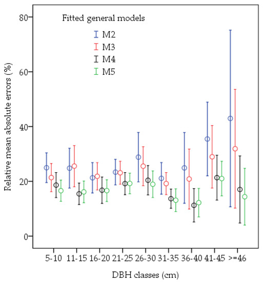 The relationship between relative errors and the classes of diameter at breast height (DBH) indicates the fitness of the general models. The error bar indicates the 95% confidence intervals of the mean.