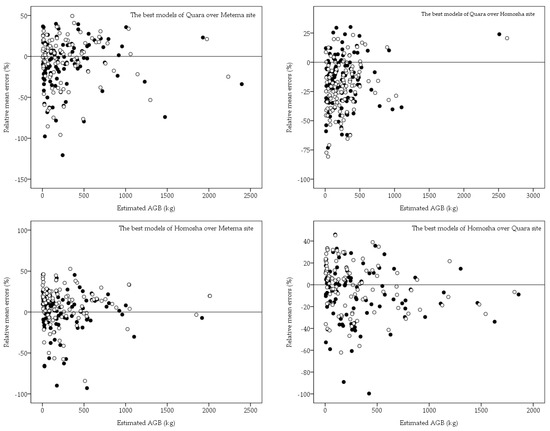 Validation results: the relative errors against the best models of estimated aboveground biomass (AGB in kg) when the models of a given site were applied for other sites. The symbols of white and black dotes refer to the validated models 4 and 5, respectively.