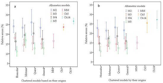 The relative errors in plot (a) and across-plot (b) AGB estimates result from combining the species in mixed-species models and using the distant models. The symbols of MM, Ch5, and Ch14 refer to the models of Mugasha and Chave, respectively, as defined in Section 2.6.1. The error bar indicates the 95% CIs of the mean.