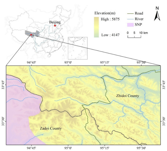The data that support the findings of this study include DEM from the Geospatial Data Cloud website (http://www.gscloud.cn/sources/, accessed on 17 March 2022), vector data from the Water Information Service Explorer website (http://www.zkyq-tech.cn, accessed on 11 March 2022/), SNP boundary data from the Tibetan Plateau Science Data Center (TPDC) (https://data.tpdc.ac.cn/zh-hans/, accessed on 17 March 2022), meteorological data from the Famine Early Warning Systems Network Land Data Assimilation System (FLDAS) (https://disc.gsfc.nasa.gov/, accessed on 25 March 2022), remote sensing data from the China Center for Resources Satellite Data and Application (http://www.cresda.com/CN/, accessed on 2 July 2021), and field investigation data from the Qinghai Snowland Great Rivers Environmental Protection Association and the Shanghai Yangtze River Delta Human Ecology Science and Technology Development Center.