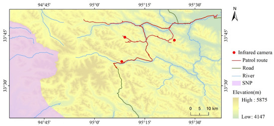 Sanjiangyuan National Park (SNP) is the first national park in China, located in the hinterland of the Qinghai-Tibet Plateau. It covers 123,100 km2 and accounts for 31.16% of the entire area of the Sanjiangyuan [51]. It consists of three areas: the Yangtze River Source, the Yellow River Source, and the Lancang River Source. In this paper, the case study area Sobchaye (33.34–33.88 N and 94.58–95.63 E) lies on the eastern edge of SNP. It is a major snow leopard habitat with a surface of 5798 km2 at an average elevation of 4927 m (see Figure 1). It sits between the Lancang River and the Yangtze River sources and includes glaciers, alpine flow rocks, alpine grasslands, alpine lakes, and other habitats. Sobchaye has a unique geographical location and an ecological environment, has complex terrain and diverse natural environment types, and is a typical mountain landscape on the Tibetan Plateau. In recent years, glaciers have been melting at a high rate because of global warming [52]. Sobuchaye also harbors an animal husbandry community. The main settlement is Dasheng Village in the northeast of Figure 1, accommodating over 600 households. According to the observations of Karki and Panthi [53], the impact of local human activities on snow leopard habitats in this area is marked due to the construction of roads. The mining ore belt also brings an unprecedented threat to the balance of the local ecosystem.