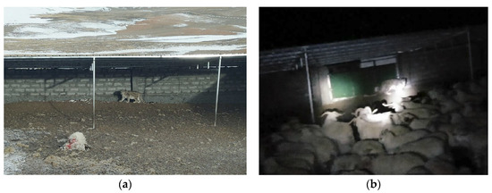 Figure 4. Photo records of snow leopards breaking into human settlements. (a) Occurred in the day; (b) Occurred in the night.