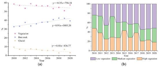 A likely significant factor in assessing the future boundaries of a national park is climate change [21]. As shown in Table 3, we divided the landscape types of Sobchaye into three categories, namely ‘vegetation’, ‘bare rock’, and ‘glacial area’, and compared these types with three major indicators of climate change, namely ‘temperature’, ‘precipitation’, and ‘sunshine duration’. The category of ‘vegetation’ was further divided into three subgroups, namely ‘high-coverage vegetation’, ‘medium-coverage vegetation’, and ‘low-coverage vegetation area’. The results showed that the bare rock area has increased by 6.7% from 2010 to 2020. In contrast, the vegetation and glacial areas have decreased by 2.1% and 6.2% (see Figure 5a). When taking a detailed look at the category of ‘vegetation’, the ‘high-coverage vegetation’ area presented a clear continued decrease, the ‘medium-coverage vegetation’ area showed a slight decrease, and the ‘low-coverage vegetation’ area continued to increase (see Figure 5b).