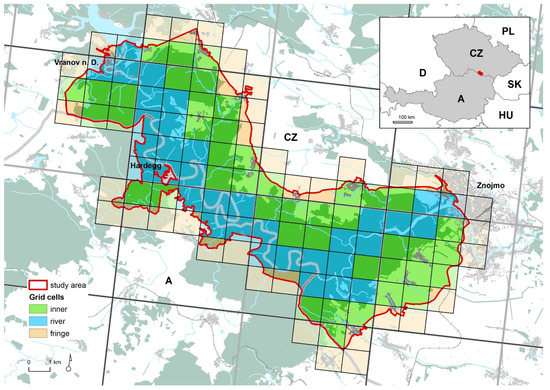 Study area in Austria and the Czech Republic divided into 115 grid cells within three groups according to the geomorphology and surveyed area of each cell (see Section 2.2): inner, river and fringe. The background map shows forests (dark green), watercourses (blue) and settlements (grey).