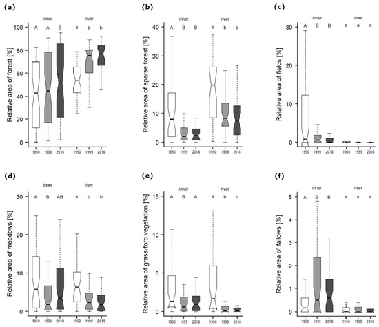 Changes in the relative areas (percentages of the whole grid cell area) of (a) forest, (b) sparse forest, (c) fields (<1 ha), (d) meadows, (e) grass-forb vegetation and (f) fallows were assessed using the Friedman test, and when significant (p < 0.001), with the post hoc Wilcoxon pairwise test with a Bonferroni correction (p < 0.01), for three periods: 1950, 1999 and 2018. Whiskers indicate the non-outlier range, with the median as the middle; boxes show 25–75% percentiles.