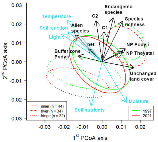 The principal coordinates analysis (PCoA) of the floristic data (Sörensen dissimilarity) of 110 grid cells in the Podyjí and Thayatal NPs and the Podyjí buffer zone from both floristic surveys (1997 and 2021). Ellipses represent groups of inner, river and fringe grid cells within both floristic surveys and are drawn around the medoids of the respective cells (see Methods); if they do not overlap, the groups differed. Only those supplementary variables that were significant in the multiple regression are shown (p < 0.001; het—landscape heterogeneity; C1—number of critically endangered species; C2—number of endangered species category C2; endangered species—number of all endangered species of categories C1–C4 according to [50]). The blue arrows represent Ellenberg indicator values, which were tested using a modified permutation test according to Zelený and Schaffers ([52]; p < 0.001 for light, temperature and moisture; p < 0.002 for soil nutrients and p < 0.003 for soil reaction).