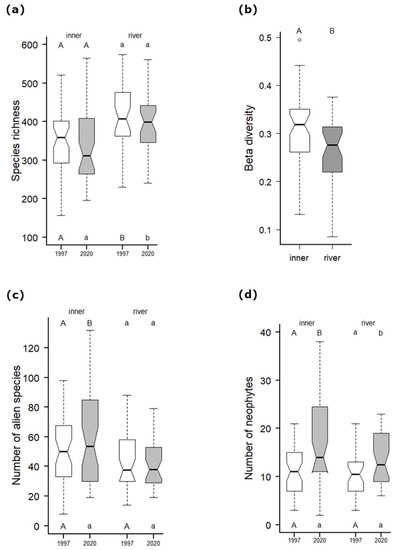 Changes and differences in (a) species richness, (b) beta diversity (Sörensen dissimilarity; non-pair t-test), (c) number of alien species and (d) number of neophytes per grid cell within both the first (1997) and the second survey (2021) separated into inner (n = 44) and river (n = 34) group cells (see Methods). The letters above boxes indicate the results of pairwise t-tests between surveys within each group, while the letters below boxes show results of the non-pair t-test between the groups (a,c,d). Whiskers indicate the non-outlier range with the median as the middle; boxes show the 25–75% percentiles.