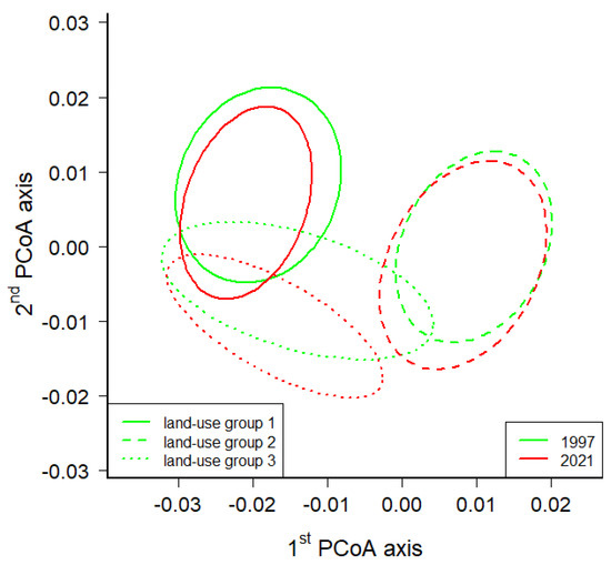 To address question 1, first, we had to calculate the Bray–Curtis dissimilarity for the land cover and the Sörensen dissimilarity for floristic presence/absence data. Then, the composition and changes in land cover and floristic data were explored using the following analyses: (1) principal coordinates analysis (PCoA) embedded mentioned dissimilarities and were combined with the Hellinger distance (supplementary variables were tested using the multiple regression with 999 permutations (p < 0.001), and Ellenberg indicator values were tested using the modified permutation test according to Zelený et Schaffers [52]), (2) permutational multivariate analysis of variance using distance matrices (PERMANOVA) [53,54] and (3) multivariate homogeneity of the groups’ dispersions (PERMDISP) [54,55]. Further, the floristic beta diversity between particular surveys was computed as the Sörensen dissimilarity.