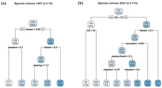 The regression trees for species richness in surveys in (a) 1997 (n = 78) and (b) 2021 (n = 115) based on the proportions (%) of individual land-cover categories per grid cells, landscape heterogeneity and proportions (%) of individual NPs and surrounding area, resp. surveyed area per grid cells (CE; within 2021). Numbers in each node represent the average of species richness in this node.