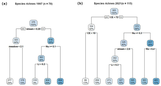 The regression trees for species richness in surveys in (a) 1997 (n = 78) and (b) 2021 (n = 115) based on the proportions (%) of individual land-cover categories per grid cells, landscape heterogeneity and proportions (%) of individual NPs and Podyjí buffer zone, as well as Ellenberg indicator values (see Section 2.2; Nu—nutrients, Re—soil reaction, Li—light), resp. surveyed area per grid cells (CE; within 2021). Numbers in each node represent an average of species richness in this node.