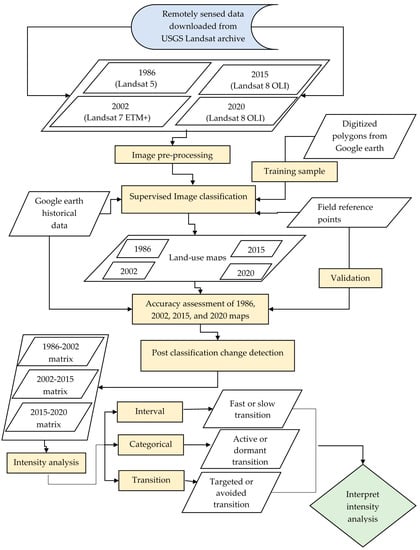 All the three levels of analysis generate a uniform intensity lines, representing a hypothetical condition in which uniform change distribution occurs across all categories. When compared with the uniform intensity, the estimated area in the interval level analysis determines the time interval with the slow or fast annual rate of change. Category level intensity exceeding the uniform line is referred to as an active category, and if the intensity is below the uniform line, it is termed a dormant category. In the same way, in transition intensity, if a gaining or losing category exceeds the uniform intensity line, it is termed as targeted. If it does not reach the uniform intensity line, it is termed as an avoided category [53]. Using equation-infused spreadsheets developed by Aldwaik and Pontius Jr, [56], the transition matrices of 1986–2002, 2002–2015 and 2015–2020 were used as inputs for calculating variations in the size and intensities of land cover types at all three levels of intensity analysis.