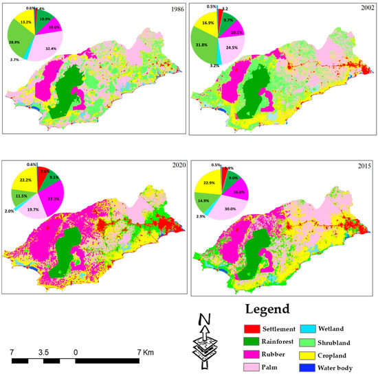 The classified LULC maps and their statistics for 1986, 2002, 2015 and 2020 are represented in Figure 4 and Table 4, respectively. Palm (32.4%) and shrubland (28.9%) were the most dominating land cover types in 1986. Cropland covered 13.2%, rubber and forest covered 10.0% and 10.9%, respectively, while settlement, wetland and waterbody occupied less than 5% of the study landscape (Figure 4). The distribution of palm covered almost the entire landscape. Information from key local informants showed that palm distribution in the western landscape was mainly coconut farms. In contrast, palm distribution in the eastern part of the study landscape was mainly oil palm farms. Small patches of palm, together with cropland and shrubland, were distributed across the landscape, primarily around human settlement (communities), whereas rubber and vast tracts of palm were limited to specified plantation blocks.