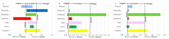 Transition level intensities for cropland for the period (a) 1986–2002, (b) 2002–2015 and (c) 2015–2020 (gains on the right, losses on the left).