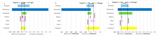 The last five years of the study period (2015–2020) had similar transition intensity trends for cropland, palm and shrubland. In contrast, this period saw expansions in rubber with transition intensity targeting cropland and shrubland and a marginal avoidance in palm (Figure 7). The rubber intensity gain from shrubland was higher than for cropland. Expansion in settlement in this period targeted cropland, shrubland, wetland and waterbody (Figure 8). Losses in settlement targeted the same land cover categories. In both gains and losses for settlement, the intensity was highest in the transition from waterbody and to waterbody (Figure 8).