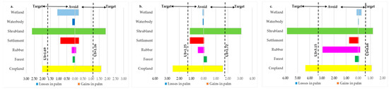 Transition intensities observed between land cover categories for 1986–2002, 2002–2015 and 2015–2020 are represented in Figure 7, Figure 8, Figure 9, Figure 10 and Figure 11. Transition intensities for rubber, settlement, shrubland, cropland and palm were the focus. The hypothetical uniform intensity is represented as vertical dash lines which appear on both sides of the chart. To the left is the uniform intensity explaining the hypothetical uniform value in the intensity of transition that accounted for the losses in the respective land cover category. To the right represent the gains in transition intensity. For example, from 1986 to 2002, the transition to shrubland targeted cropland and palm and avoided the other land cover categories (Figure 11). Similarly, losses in shrubland targeted cropland, palm, and settlement (Figure 11). Expansions in cropland in 2002 targeted palm, shrubland and wetland, while losses in cropland targeted settlement in addition to palm and shrubland (Figure 9). Losses in palm targeted cropland and shrubland (Figure 10), while gains in settlement targeted shrubland, cropland and waterbody (Figure 8). From 2002 to 2015, reductions in shrubland similarly targeted cropland and palm, with expansions targeting cropland and marginally targeting wetland and waterbody. Expansions in cropland in this same period similarly targeted palm and shrubland, while reductions in cropland area targeted shrubland, settlement and slightly targeted wetland. Gains in palm targeted shrubland, while losses targeted cropland.