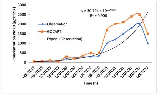 In order to verify the results of GOCART scheme, the PM10 values of Natanz station located in the study area and also the values of dust surface concentration of the MERRA2 global reanalysis were used. For this purpose, the surface dust concentration values simulated using WRF-Chem combined with the GOCART scheme on 19–21 July 2015 (as shown in Figure 5) were compared with the observed dust concentration values of Natanz station (Figure 6). Also, Figure 7 shows the time series of dust concentration by GOCART scheme related to the storm of 19 to 21 July 2015.