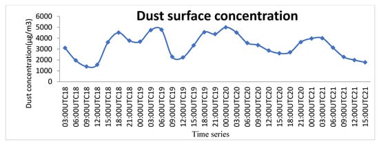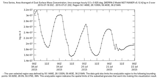 In order to investigate the temporal pattern of dust surface concentration in the study area, time series of dust surface concentration from the MERRA2 re-analysis with interval 3 h were used (https://gmao.gsfc.nasa.gov, accessed on 1 January 2020).