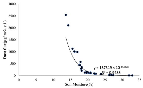 Using the Pearson correlation coefficient, the correlation between soil moisture and vertical dust flux was investigated using SPSS software. Correlation of vertical dust flux with soil moisture was −0.643, which is significant at the 0.01 level.