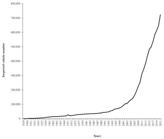 The number of annually inspected vehicles between 1929 and 2021 in Mongolia. All registered vehicles are legally required to be inspected annually. Therefore, the number of annually inspected vehicles could represent the number of registered vehicles in Mongolia.