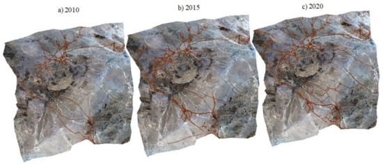 The other type of dirt road is the “soil” road, which is not legally registered as a national route. There is no administrative agency in charge of looking after or maintaining these roads. Within Khanbogd soum, as of 2010, we estimated 913.69 km of soil roads, mainly with single tracks (72% of the total soil road within the soum). By 2020, the soil road increased to 2243.91 km, covering 2241 ha (Table 1; Figure 4). About 42% of the soil road has a single track, while the remaining 58% is a corridor with an average width of 26.5 m and three to four tracks (Figure 3). The one-track dirt roads connect seasonal herder camps and see relatively little traffic. Other soil roads with corridors connect soum centers to nearby towns and mining camps.