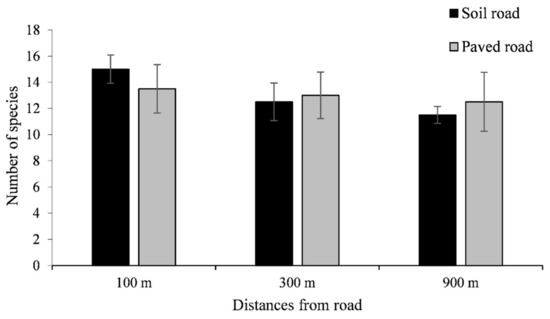 Plant species richness decreased with the increase in distance intervals from 100 m to 300 and 900 m (15, 13, and 11 species, respectively) along the soil road, whereas there was no difference among the distances from the paved road (Figure 5). No difference in species richness (p = 0.09) was observed between the road types.
