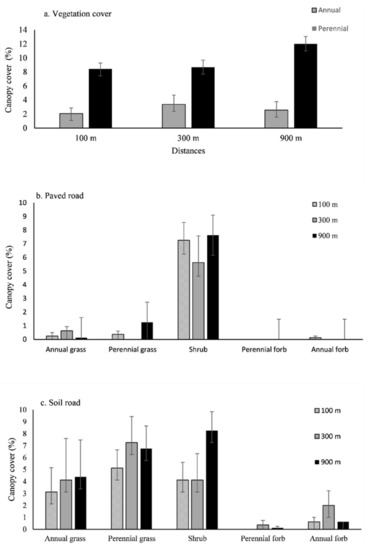 The difference in road types significantly affects the total canopy cover, perennial and annual grasses, and annual forbs. The distances from the roads and their interaction with the road types do not affect the total canopy (Figure 6a) and canopy cover of plant functional groups (Table 3).