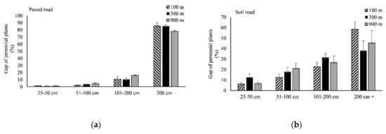 Perennial plants grew closer to each other along the soil road, whereas the vegetation along the paved road had a total spacing of more than 200 cm (Figure 7). The road types had a significant impact on the gap groups of 0–50, 51–100, 101–200, and more than 200 cm for the basal distance between perennial plants. The basal gaps were unaffected by distances from the roads (Table 4).