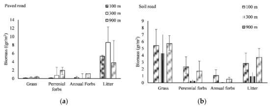 Plant biomass by functional groups at the three distances from the roads. (a) The paved road. (b) The soil roads. Each bar represents mean ± 1 SE.