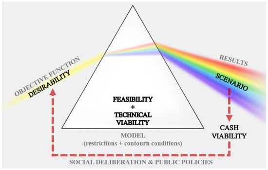 Desirability: This is a fundamental feature, mainly considered in the SAFRA modeling through the adoption of a social priority to be optimized through the objective function. Some specific societal goals can also be incorporated by means of the restrictions considered in the kind of agrarian practices accepted, on the type of food to be provided, or in the constraints set by environmental regulations. In the latter case, they become backcasting elements incorporated in the scenario exploration through the optimization exercises. In one way or the other, the model is run under a clear social and political intentionality.
