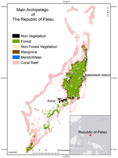 24]. Given the cultural, subsistence, and economic importance of reef ecosystems to Palau, land cover and land use have received increasing attention by the Palauan Government regarding how to effectively manage land–sea connections for coral health.
