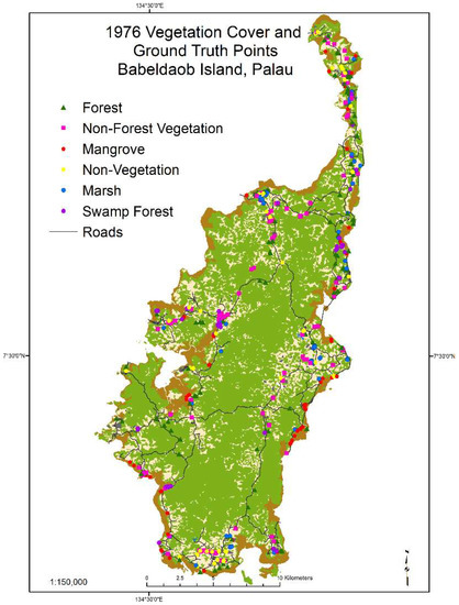 36]. Data from Global Forest Watch, which compares 30 m Landsat classifications over time, indicate a loss of 1.2% of forest with at least 10% canopy cover on Babeldaob from 2000 to 2014 and forest gain of 0.7% from 2000 to 2012 [