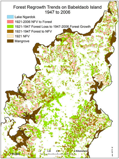 54]. Despite the limitations of working with diverse remote sensing datasets, this broad temporal comparison uncovered previously unrecognized important land-cover trends for Babledaob and indicate that, despite recent major infrastructure developments, forest and mangrove cover has remained robust, and non-mangrove forest continues to recover naturally from deforestation that occurred during the Japanese colonial administration more than 70 years ago. However, much of the recent forest growth is characterized by small statured forest trees and shrubs, and the landscape is still described as a mosaic of forest and non-forest vegetation with substantial forest edge subject to wildfire and other land-use disturbances [