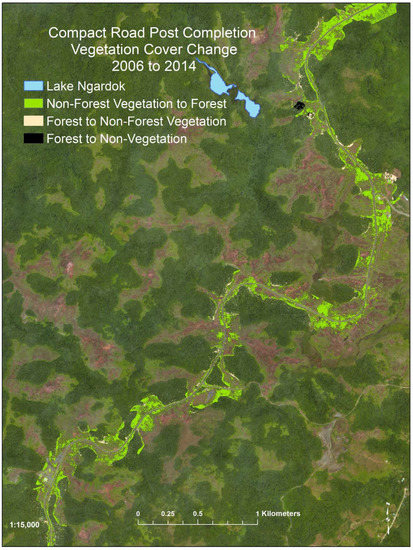 Figure 7), and through the completion of the Compact Road in 2007 to our 2014 survey. We found that the 2014 WV2 USFS thematic map and classification indicated that relative forest cover increases were largest in areas adjacent to the Compact Road (15–22%,