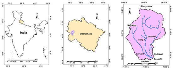 - Jana, C.; Mandal, D.; Shrimali, S.S.; Alam, N.M.; Kumar, R.; Sena, D.R.; Kaushal, R. Assessment of urban growth effects on green space and surface temperature in Doon Valley, Uttarakhand, India. Environ. Monit. Assess. 2020, 192, 257. [Google Scholar] [CrossRef]