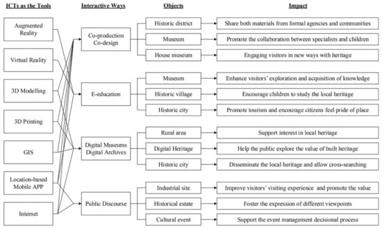 Various digital products can improve our understanding of people-centred heritage and encourage the public to take part in heritage conservation (see Figure 1). Augmented Reality, Virtual Reality, and 3D modelling help audiences experience the heritage site more intuitively, so that they can better understand the multi-level value of cultural heritage [5,6,7]. ICT also makes it easier for residents to participate in the co-design and co-production process and collaborate with professionals [8]. At the Bishops’ House Museum, located in Sheffield, UK, digital augmentation helps engage visitors, in a co-design way, with architectural heritage [8]. Three-dimensional printing technology allows models of buildings to be constructed from archaeological drawings [9], which allows the recovery of more precise architectural details and reduces the damage to on-site exhibits significantly. Geographic Information Systems (GIS) assist with mapping and archiving of rural and urban heritage sites, utilising big data [10,11]. In Marmo Platano, the northwestern part of the Basilicata Region (Italy), a website which provides urban planning information to the public is combined with a web-based GIS tool and a blog to obtain citizens’ feedback [12]. Location-based mobile apps, as well as some websites, promote the output of cultural heritage values with a very important educational function [13,14,15,16]. For instance, an app is developed to let the visitors learn historical facts by playing a mobile game while visiting the museum Palazzo Madama in Italy [13]. The Kampung Dolanan project, which is a valuable historic village in Indonesia, was created to encourage children to study heritage, histories, and traditional customs while playing games located in their own residential area [14].