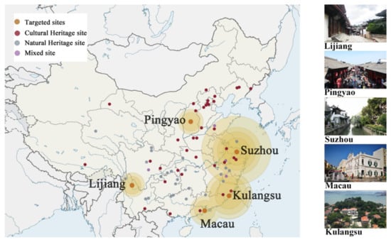 Chinese World Cultural Heritage Sites were used in the design and development of this study. According to information made public on UNESCO’s webpage, China owns 56 inscribed world heritage properties (second only to Italy in the WHL) in 2021, in which 38 are cultural heritage, 14 are natural heritage, and 4 are hybrid properties [45]. With a metropolitan heritage as the focus point, a filter was implemented to identify urban areas with a population of more than 500,000 residents (by January 2021) to make certain the data was sufficient and the samples were diverse. After screening, locations that fulfilled such requirements were Yunnan’s Old Town of Lijiang (1997), Shanxi’s Ancient City of Pingyao (1997), Jiangsu’s Classical Gardens of Suzhou (1997, 2000), Macau’s Historic Centre (2005), and Fujian’s Kulangsu Historic International Settlement (2017). Figure 2 shows the geographical distribution of China’s Urban Heritage and Other World Heritage Sites.