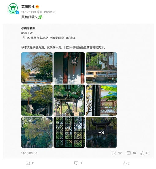 A reposted Weibo by Suzhou Gardens (verified as official account) commenting “don’t miss the autumn” with pictures. Source: Weibo.com (https://weibo.com/suzhouyuanlinlvhua (accessed on 1 November 2021)).