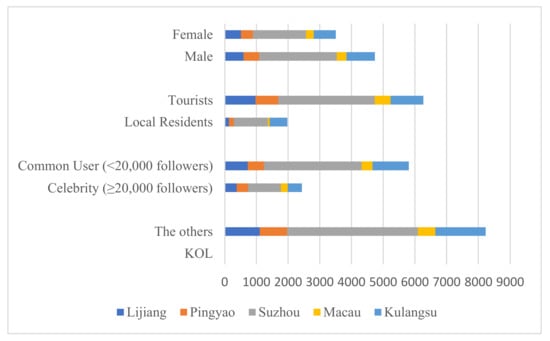Users who shared their viewpoints regarding certain urban heritage sites online are composed of a niche online society. The result shown in Figure 4 illustrates the proportion and number of both genders, the number of locals and visitors, and the number of defined celebrities and KOLs. Among the 8239 users found, male users consisted of 4738 people, accounting for 58%, while female users consisted of 3901 people, accounting for 42%. The gender ratio of male to female users is calculated to be 135%. Compared with the data collected in the 2021 China Seventh National Census Bulletin, which shows 105%, the proportion of men is significantly higher in this case [57]. In addition, according to the collected region information from the users’ profile, only one-quarter of users were considered as locals, indicating that most users were comprised of tourists from other regions. At the same time, nearly a third of the participants with more than 20,000 followers were defined as celebrities in this study, which was a lot more than the overall registration proportion, that was estimated to be around 0.3%. Due to Weibo’s data-sharing restriction, the priority of accessing API is to obtain the account information of well-known individuals who have been authenticated. In other words, in the complete dataset of Weibo, the proportion of online celebrities will be much lower. A total of 10 KOLs were screened out, accounting for 0.1% of all acquired users. This article only makes simple judgments based on the number of reposts, likes, and comments, which has certain flaws. Further work should explore discussions relating to the KOLs’ influence and the identification of KOLs.
