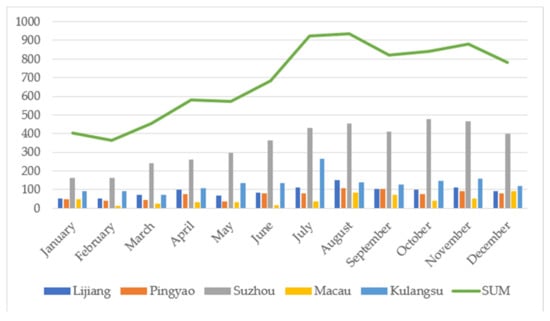 Table 3 shows that the garden of Suzhou attracts the most attention of the Weibo users and ranks first place, with 4722 searching results. Lijiang, Pingyao, Kulangsu are in the middle position with 1264, 1068, and 1725 posts, respectively, but are far behind Suzhou, with almost 50% fewer posts. Macau has received less data than all the other selected heritage sites. This may be due to the tendency of using Western social media platforms in Macau.