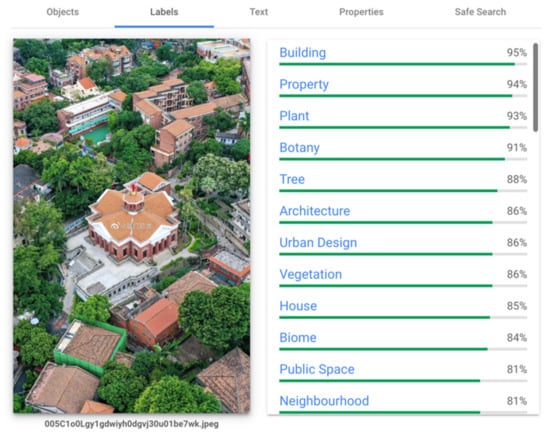 By accessing the Google Vision API, this research has carried out label detection on the obtained pictures, as shown in Figure 6. The default label set for detection because the number of images obtained was less than 7000, which is not enough for Google Vision to perform machine learning based on the division of spatial categories. In response to the issue of machine errors, after obtaining a dataset containing label descriptions, a manual selection of 700 pictures were randomly sampled for a second verification. The number of labels assigned to each picture is different, fluctuating from a few to even more than thirty. Eventually, 64,285 labels were detected and obtained on 6442 annotated images that made up the dataset. On average, each picture was accompanied by 9.98 labels. After the dataset was processed by the pivot table and count function, it was further classified into 1530 tags, such as Building, Plant, Sky, Tree, Window, etc.