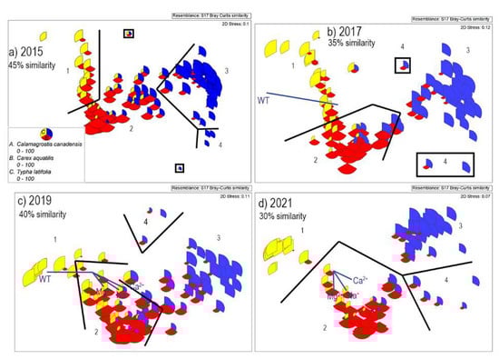 NMDS ordinations of vegetation plots sampled in (a) 2015, (b) 2017, (c) 2019, and (d) 2021. Clusters of plots recognized as plant communities (1–3) divided by black lines, 4 = outlier plots. Abundance of dominant species in individual plots shown by segmented bubbles across the ordination—Typha latifolia (yellow), Carex aquatilis (red), and Calamagrostis canadensis (blue). Significant environmental gradients plotted as vectors (blue lines). DTW = distance of the water table from soil surface; water tables increase above the soil surface to the left, water tables increase below the soil surface to the right; Ca2+, Mg2+, and Na+ concentrations increase to the lower right.