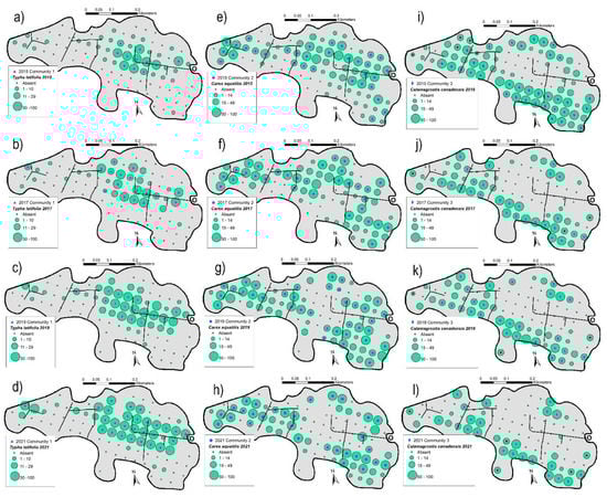 Spatial distribution of three plant communities (1–3) on Sandhill Wetland for (a,e,i) 2015, (b,f,j) 2017, (c,g,k) 2019, and (d,h,l) 2021, with abundance of dominant species in each. Distribution of Plant Community 1 (blue triangles) with abundance (as % cover) of Typha latifolia overlain (a–d). Distribution of plant Community 2 (blue circles) with an abundance of Carex aquatilis overlain (e–h). Distribution of Plant Community 3 (blue diamonds) with an abundance of Calamagrostis canadensis overlain (i–l). Black circles indicate outlier plots (Group 4). O = Outlet of Sandhill Wetland.