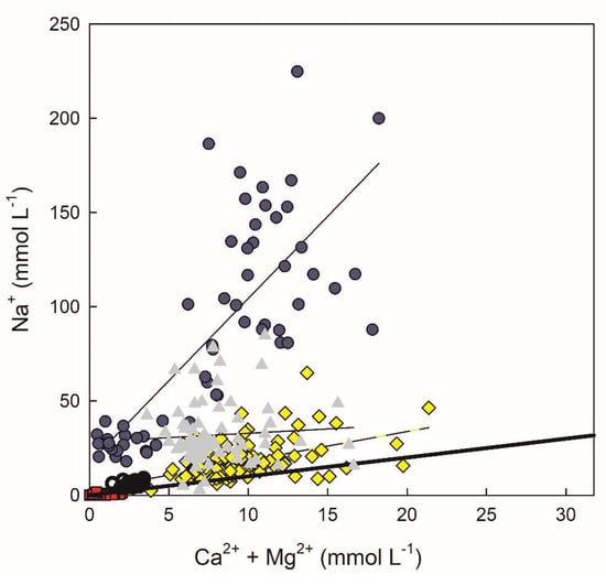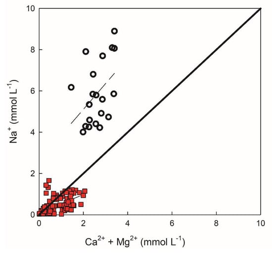 Relationship between Na+ and divalent cations (Ca2+ + Mg2+) for natural rich fens in Alberta (red squares, r2 = 0.347) and brackish wetlands (black circles, r2 = 0.187). Thick line is a 1:1 concentration of cations in mmol L−1.