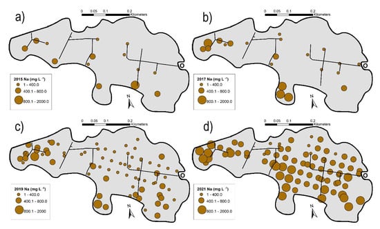 Distribution of Na+ concentrations in surficial water across Sandhill Wetland in (a) 2015, (b) 2017, (c) 2019, and (d) 2021. Concentrations shown divided into three categories (1–400, 401–800, and 801–2000 mg L−1). O = Outlet of Sandhill Wetland.