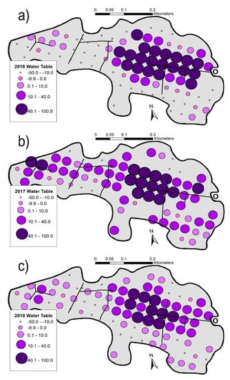 Water tables vary between years [] and over the growing season, with seasonal highs in May and early June due to snowmelt and influxes from surrounding uplands. Water tables decrease over the growing season and stabilize in July and August, periodically recharged from summer storm events []. We measured water tables during vegetation surveys in 2016–2019 in early August, during a period without precipitation during the previous week. Our data reflect a growing season relative water table for mid-summer each year. Water tables at each gridded plot were measured relative to the soil surface with a 30 cm ruler. We placed the measurements into five categories representing: deep water (40.1–100.0 cm) above the soil surface, shallow water (10.1–40.0 cm) above the soil surface, water just above the soil surface (0.1–10.0 cm), moist soil with water near to just beneath the soil surface (0.0–−9.9 cm), and dry soil with water −10–−50 cm beneath the soil surface.