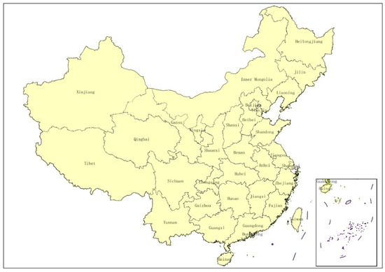 This study selected panel data comprising 31 provinces, municipalities, and autonomous regions in China (Figure 1) from 2010 to 2019. The data were obtained from different yearbooks published from 2011 to 2020, including The China Statistical Yearbook, The Almanac of China’s Finance and Banking, The Finance Yearbook of China, and The China Rural Statistical Yearbook, while part of the data was obtained from the National Bureau of Statistics of China website.