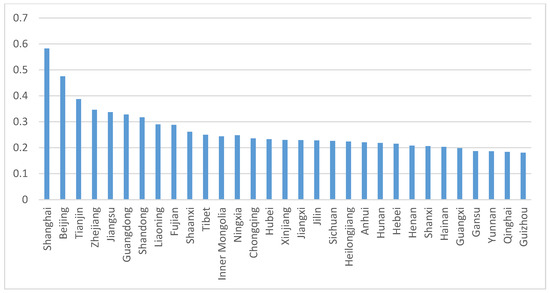 The average comprehensive evaluation index of rural urbanization in China’s provinces, municipalities, and autonomous regions from 2010 to 2019 is depicted using a histogram, as presented in Figure 2. Figure 2 indicates that the average comprehensive evaluation index of rural urbanization in most areas was 0.2–0.3. Shanghai had the highest average comprehensive index, and the comprehensive evaluation index was 0.582. This occurred because Shanghai is economically developed; many rural areas have been urbanized, and the proportion of urban population is much larger than that of other provinces. Beijing ranked second, with an average comprehensive index of 0.475. As the center of Chinese economy, politics, and culture, Beijing is the most quickly urbanizing area in China. Gansu, Yunnan, Qinghai, and Guizhou, whose average index values were all below 0.19, marked the lowest comprehensive evaluation indices of rural urbanization. This was because these areas are located in arid and plateau areas in Western China, with inconvenient transportation and backward economies. Moreover, their urbanization seriously lag behind by the coastal and central areas in China.